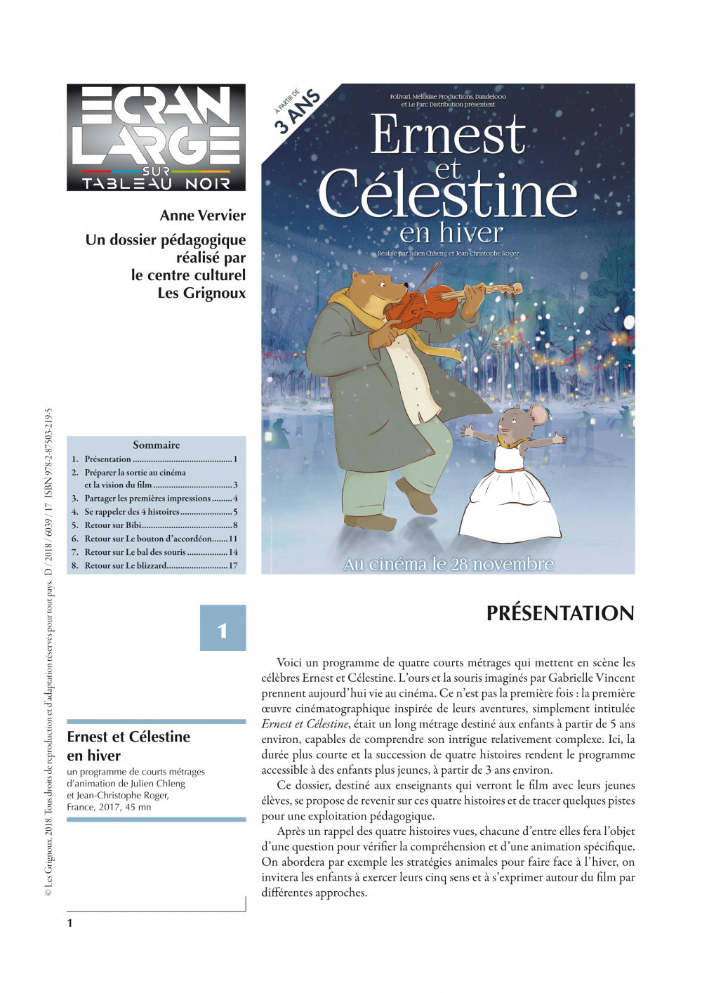 Que ce soit grâce au dessin animé de Stéphane Aubier, Vincent Patar et Benjamin Renner sorti en 2012 ou au travers des albums de l'auteure et et illustratrice belge Gabrielle Vincent, dont s'inspirent les deux films, les petits enfants connaissent déjà très certainement ces tendres personnages, à la fois si proches et si différents : Ernest, un gros ours qui aime la musique et la confiture, et Célestine, une petite souris orpheline pour qui il est devenu un vrai père. Désormais, ces deux-là partagent la même maison et, à l'approche de l'hiver, ils préparent avec effervescence l'hibernation d'Ernest...